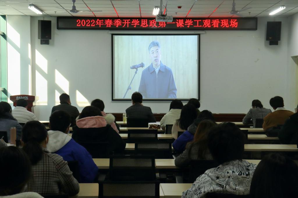 2月28日,党委学工部组织辅导员和学生代表在艺术楼202室组织观看2022年春季开学思政第一课暨大中小学思政课集体备课活动,副校长王万玲莅临观看现场。