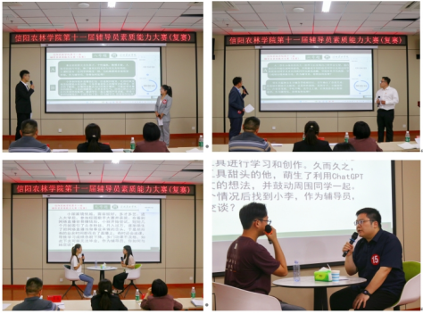 复赛环节采用案例研讨和谈心谈话的形式展开。案例研讨环节采取“AB角随机组合”,以“我提问,你回答”的方式展开,在个人阐述和互相提问中,共同剖析案例中的核心问题,展现出良好的现场应变能力和逻辑思辨能力;谈心谈话环节主要考察辅导员对学生特征、学生成长成才规律的了解把握程度,对学生的教育引导能力、解决理论困惑和实际问题的能力。