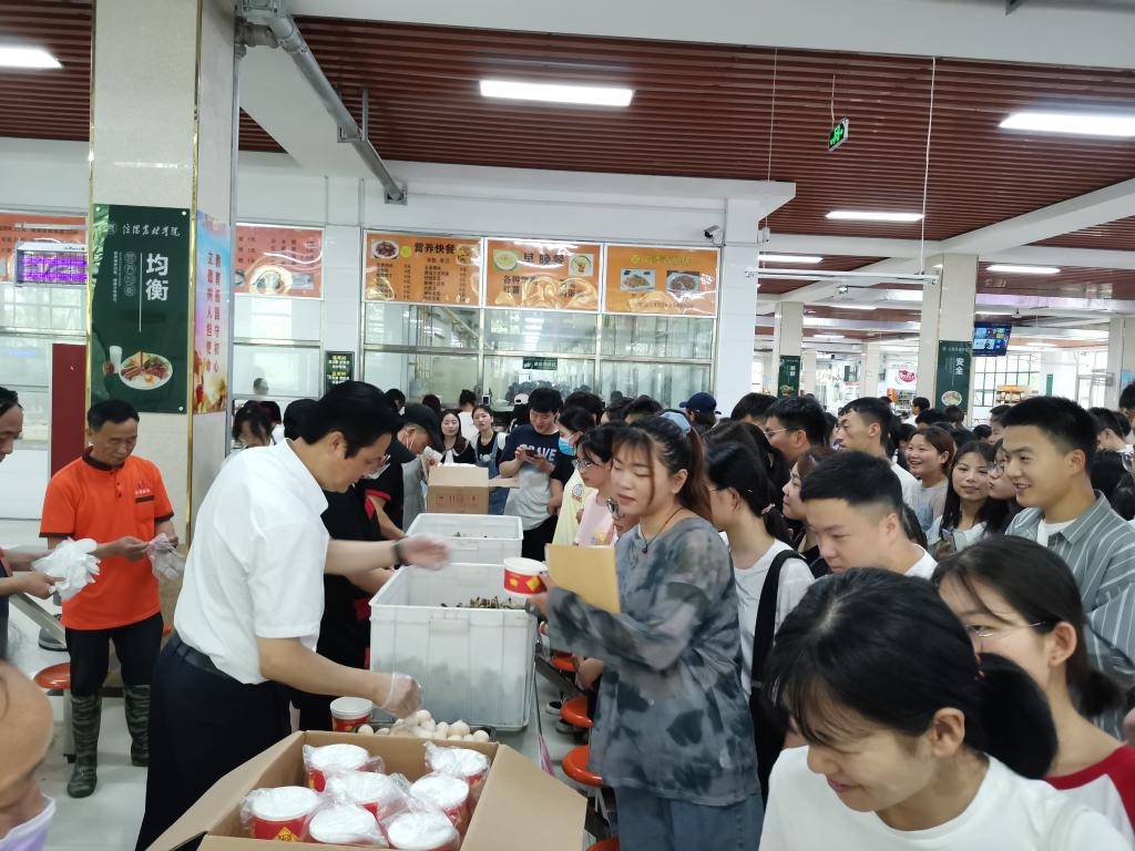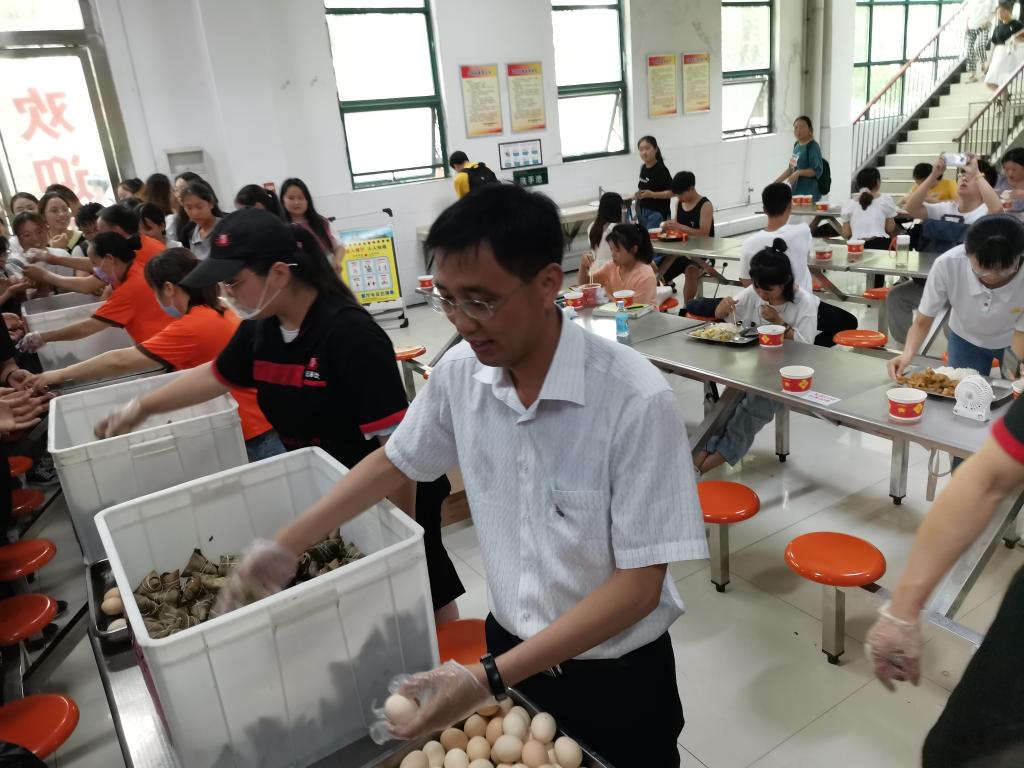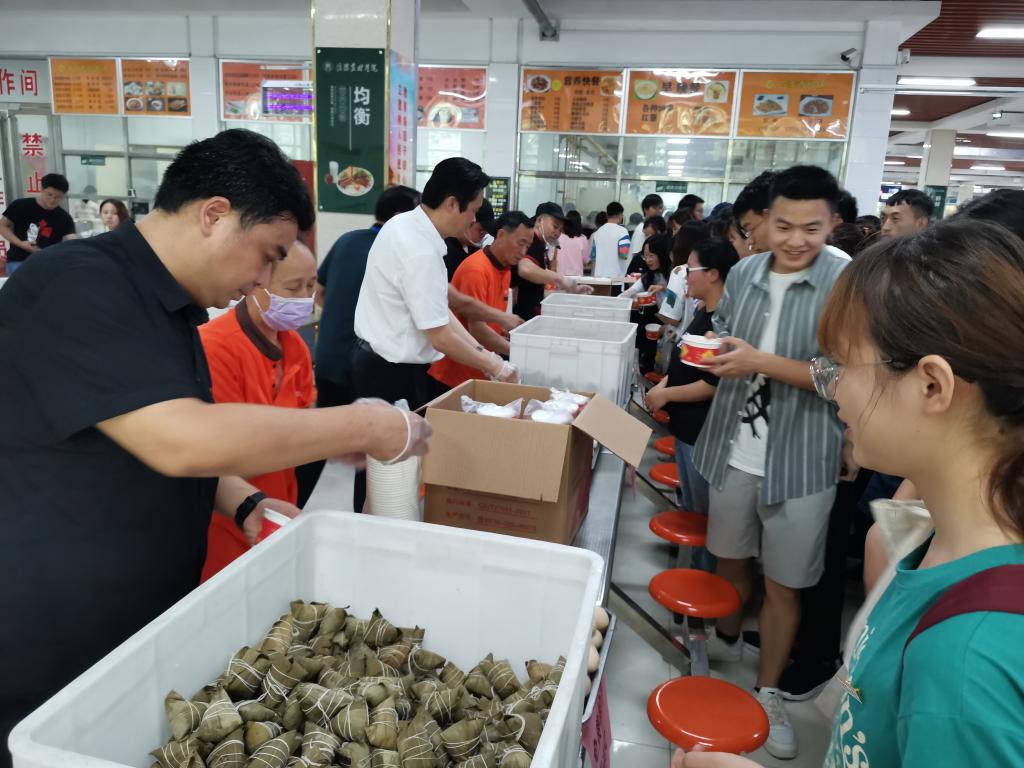 6月14端午节当天,后勤管理处(后勤服务总公司)提前谋划采购粽子和鸡蛋,从早餐开始在beat365在线平台官网5个餐厅同时开展免费送粽子送鸡蛋活动。中午活动达到了高峰,后勤党总支书记李友国、后勤管理处(后勤服务总公司)处长(总经理)李巨、后勤管理处(后勤服务总公司)副处长(副总经理)厉相卿亲自到二餐一楼为排队的学生们派送粽子。活动结束时后勤采购的近一万个粽子和一万个鸡蛋全部分发一空。