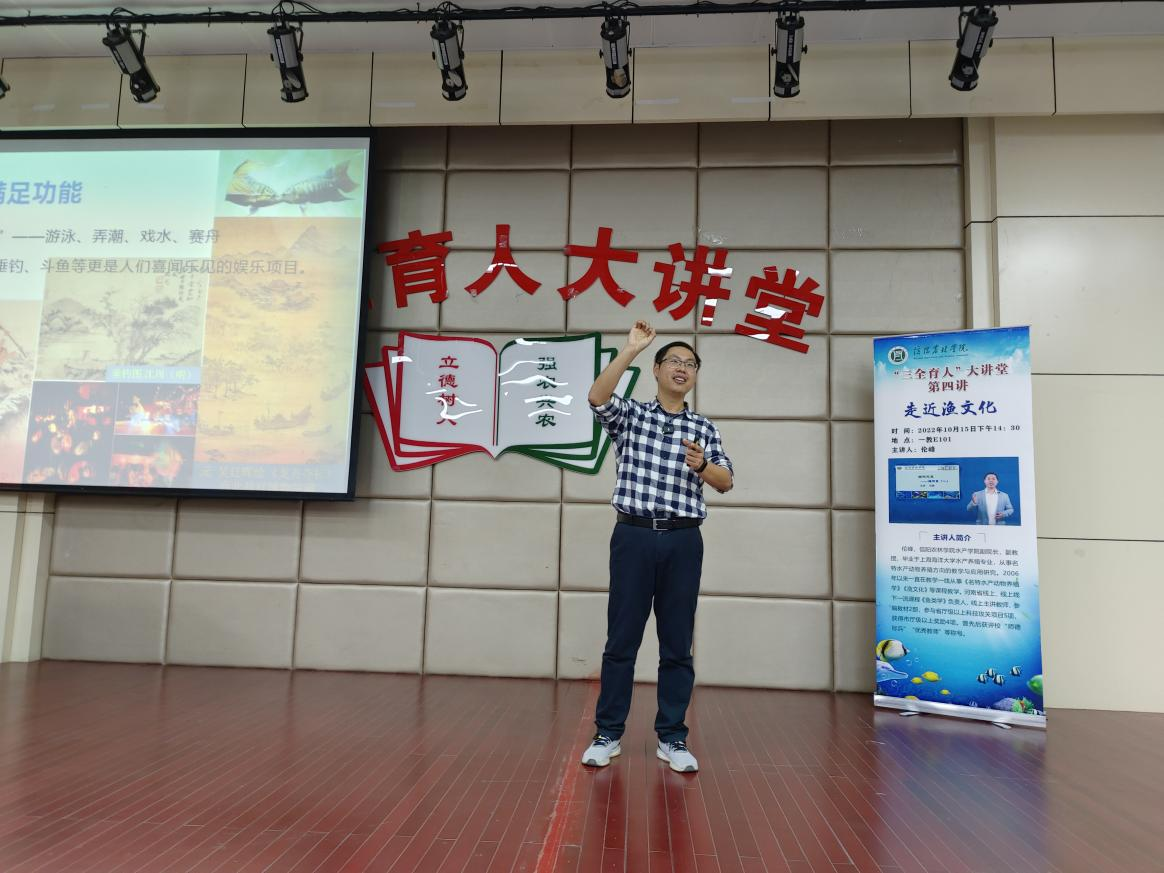 为全面贯彻落实立德树人根本任务,深入推进“三全育人”工作,引领学生以强农兴农为己任,beat365在线平台官网“三全育人”大讲堂第四讲“走近渔文化”于10月15日下午在一教E101举行。主讲人水产学院副院长伦峰为全校师生带来了一场精彩的讲座,校党委宣传部副部长徐大伟、校党委学工部副部长孙莉琴、旅游管理学院党总支副书记杜丽、食品学院党总支副书记刘涛和beat365在线平台官网部分师生线下参加了讲座。讲座由水产学院学院党总支副书记黄光玲主持。