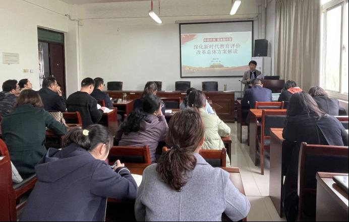 商信华从《总体方案》的背景、目标、总体思路、重点任务等方面作具体传达与学习,并解读文件中的亮点:新时期教育坚持以立德树人为主线,坚持把师德师风作为第一标准,完善教学评价,突出教育教学实效。同时提出可行性建议,一是推进教育评价综合改革,以为党育人、为国育才为根本;二是实事求是,以提高学校治理能力和办学水平为目标;三是破立并举,完善体系,以稳步推进、有效实施为方针。