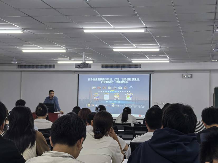 随后,华为工程师王宝曈结合二十余年ICT行业实践经验,展开了深入浅出的分享。他从物联网技术演进脉络切入,重点解读了华为鸿蒙智能终端生态、鲲鹏物联网云平台在农业物联网、智慧安防等领域的应用案例:“在河南本地的智慧农场项目中,通过华为IoT传感器与云平台的协同,实现了土壤墒情、作物长势的实时监测,亩均节水30%以上,这正是物联网技术赋能乡村振兴的生动实践。”针对新生关切的学习方向,王宝曈特别梳理了“感知层-网络层-应用层”的核心知识体系,建议新生重点夯实C语言、数据结构等基础,同时主动参与华为开发者联盟的开源项目积累实战经验。在互动环节,新生围绕“鸿蒙开发与传统物联网技术的差异”、“华为ICT认证对就业的助力”等问题踊跃提问。