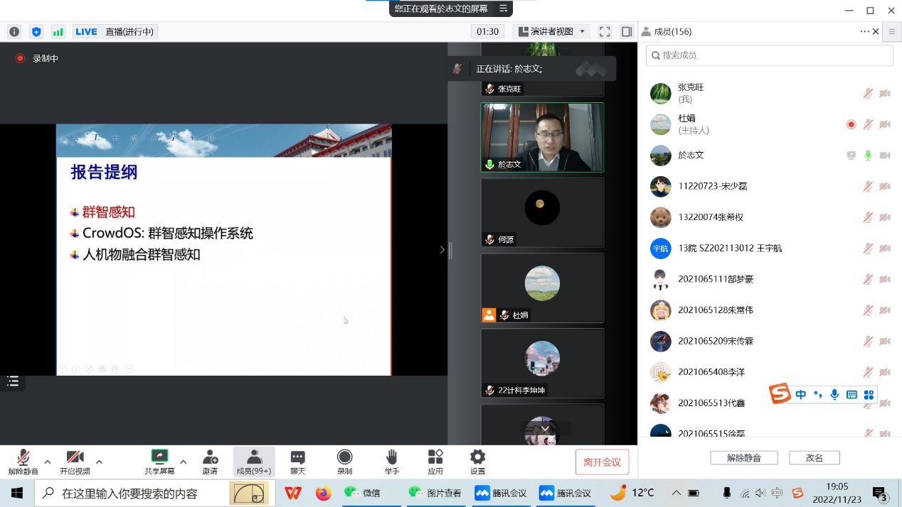 为拓宽专业教师学术视野,营造良好的学术氛围,促进新知识、新技术的传播,2022年11月23日晚7点,物联网工程教研室全体专业教师参加题为“CrowdOS:群智感知理论、方法与系统平台”的线上学术交流会。本次交流会主办单位为清华大学软件学院,主讲人为於志文教授。