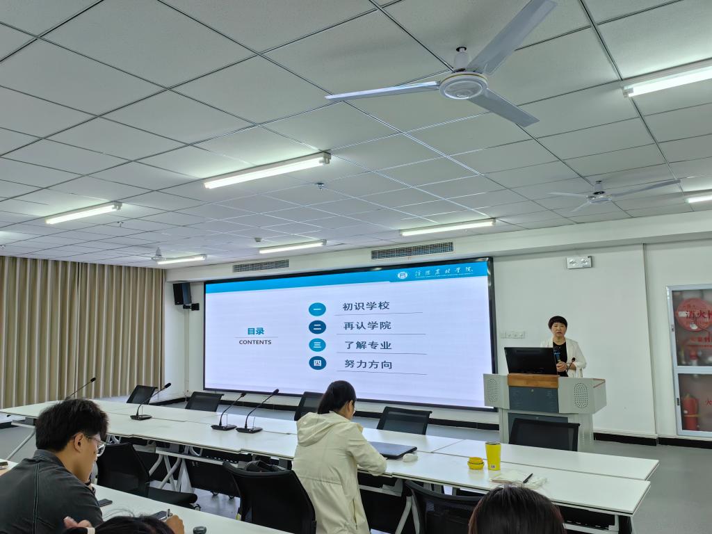 讲座伊始,商信华从信阳地区的地缘优势与发展历史引入,围绕学校的历史沿革、学院的办学历程、教学条件、专业建设、课堂教学等方面详细介绍了学院的发展情况。随后,向新生们详细展示了近年来学院师生在教育教学、技能竞赛、考研考公及创新创业各方面取得的多项成绩,并鼓励新同学们一定要努力学习,志存高远,精细学问。最后,对同学们提出了五点期望,一是转换角色、明确目标;二是树立目标、学会学习;三是心存感激,学会珍爱;四是团结友爱、学会共处;五是追逐梦想,勇担重任。