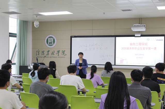 为了提高同学们的疫情防控意识、增强爱国精神、强化青年使命担当与社会责任感,2020年5月25日上午,信息工程学院于图书馆智慧教室组织开展了线上线下2020届本科毕业生返校复学第一课,院长商信华、院党总支副书记朱猛参加,副校长赵一鹏莅临指导,并为同学们送上毕业祝福。