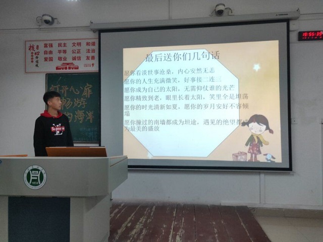 心理委员首先通过向同学们普及心理健康方面的相关知识,让大家对心理健康问题有了更准确、更深入的了解。其次,为了调动同学们的积极性,增强班会互动效果,组织大家共同参与了多种心理小游戏。最后,部分同学上台分享了自己在本次班会中的感悟。班会在同学们的热烈交流中圆满结束。