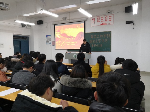 2019年1月8日17时30分信息工程学院于二教116举行了以“不忘跟党初心,争做出彩河南人”为主题的团课。院团总支书记朱猛主讲。