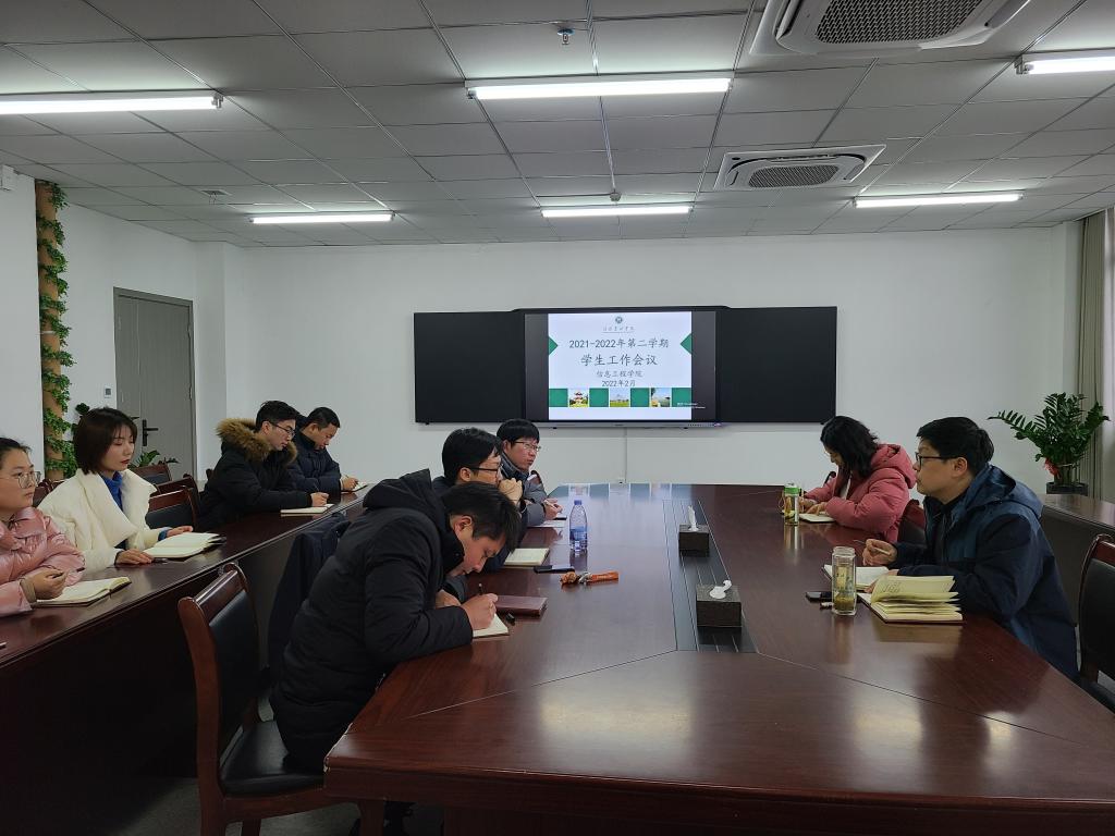 2月18日下午,信息工程学院在双创中心615室召开新学期学生工作例会,学院党总支副书记朱猛、团总支书记严舒平及全体辅导员参加了例会,会议由副书记朱猛主持。