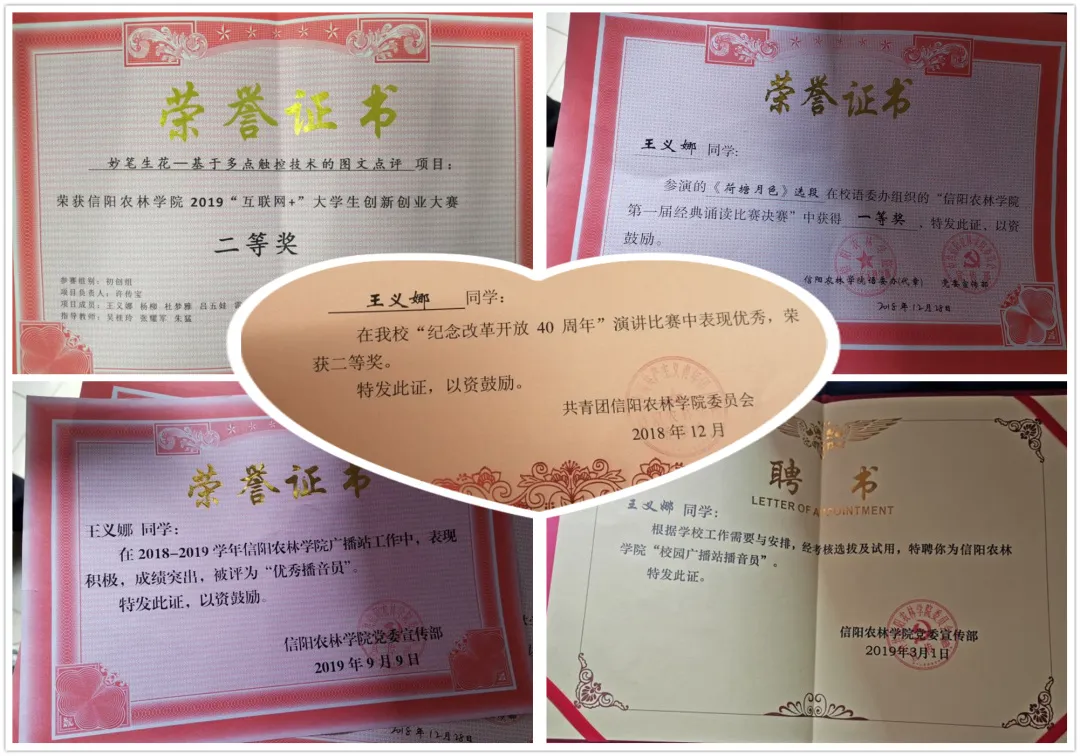 在掌握理论知识的基础上,王义娜同学注重知行合一,积极参加社会实践,力求全面发展。入校以来,凭借自己出色的口才和动人的音色,进入了校广播站担任播音员。同时,她积极参加各项活动并取得佳绩。在2018年12月beat365在线平台官网经典诵读比赛中荣获校级一等奖;在2018年12月beat365在线平台官网庆祝改革开放40周年演讲比赛中荣获校级二等奖;在2019年6月beat365在线平台官网大学生创新创业大赛中荣获校级二等奖;在2019年6月河南省2019年中华经典诵写讲比赛中荣获经典诵读大学生组二等奖。