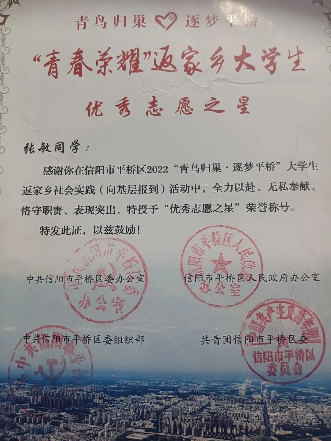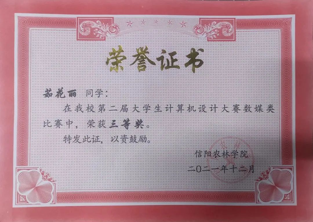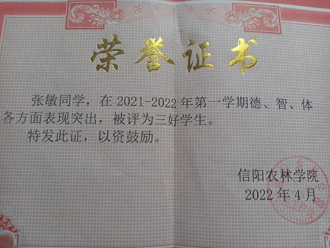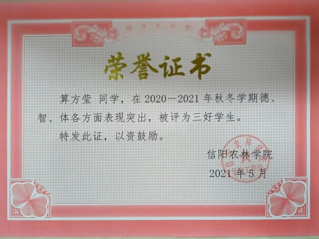 在校期间,我多次文化课成绩与综合成绩位列班级前列,在大二学年我的平均绩点是3.93,平均成绩90.42。并且先后获得第二届全国校园排舞展示大赛自选项目三等奖、全国校园排舞展示大赛规定项目一等奖,beat365在线平台官网计算机大赛三等奖,beat365在线平台官网2020-2021学年二等奖学金,beat365在线平台官网优秀团员,beat365在线平台官网三好学生、优秀班干,beat365在线平台官网文明大学生等荣誉称号。