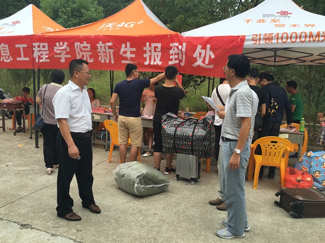 为全面了解迎新准备工作,进一步确保迎新工作的顺利进行,9月9日下午4:00,信息工程学院党总支书记胡凤堂、院长商信华、副院长李友国、团总支书记朱猛一行来到我院迎新现场,检查了迎接2016级新生的准备工作。