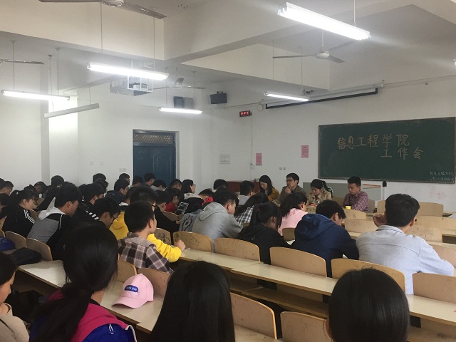 在beat365在线平台官网春季运动会即将来临之际,为进一步增进学生会各部门的协作能力,确保各项工作顺利进行,4月8日下午1点,信息工程学院在二教203召开学生工作会议。学院团支部书记朱猛、17级辅导员、学院学生会主席团、17级各班运动员以及班长团支书参加了会议,会议由院团支部书记朱猛主持。