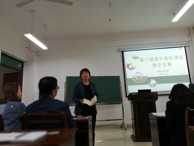2018年4月24日,信息工程学院在1A307举办了青年教师课堂教学技能竞赛复赛。6个教研室经过初赛推荐的8名青年教师参加此次复赛,学院党总支书记胡凤堂,院教学督导员何勇、赵喜玲、朱猛,教研室主任侯丽萍、潘赟及学生代表陈明担任评委,院长商信华赛后做了点评。复赛由高等数学教研室主任杨艳华老师主持,学院全体教师观摩了此次复赛活动。