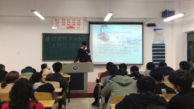 古语有云:正心,修身,齐家,治国,平天下。廉洁修身乃齐家之始,治国之源,平天下之基。所谓“廉”,应是一种思想上的意识,自我约束的意识,坚持正直的意识。为加强我院学生廉洁自律意识,2019年4月25日晚,信息工程学院团总支举办了“廉洁自律,从我做起”主题团课。信息工程学院18级全体同学参加,各班辅导员主讲。