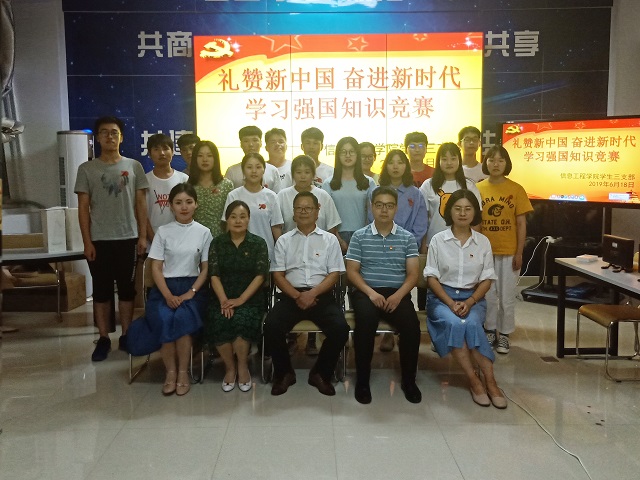 为进一步学习好、宣传好、贯彻好党的十九大精神,调动学生党员学习的积极性和主动性,信息工程学院学生党支部于6月18日晚在1A404举办了“礼赞新中国,奋进新时代”学习强国知识竞赛活动,我院党总支书记胡凤堂、组织员赵喜玲以及各支部书记到场参与了此次活动