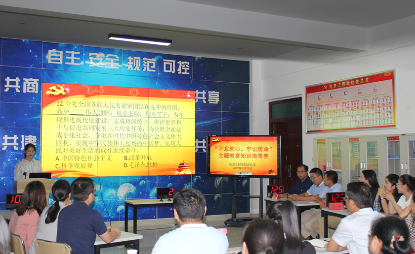 9月26日下午6:30,信息工程学院在科技楼1A404成功举办“不忘初心、牢记使命”主题教育知识大赛,学院党总支和六个教工支部全体党员参加活动。活动由数字媒体技术2018级同学陈思宇主持。