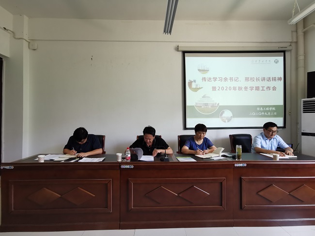 2020年9月2日下午,信息工程学院在1A307召开了传达学习余书记、邢校长讲话精神暨2020年秋冬学期工作会,院党总支书记梁其宇、院长商信华、院党总支副书记朱猛、副院长何勇以及学院全体教职工参加,会议由朱猛主持。
