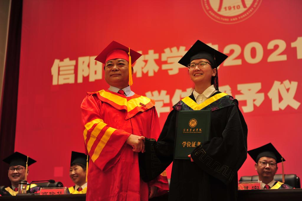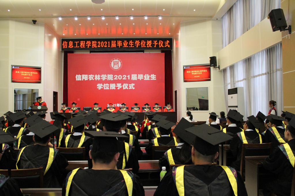 学位授予仪式在庄严的国歌声中拉开帷幕。何勇宣读了学校2021届毕业生学士学位授予决定及信息工程学院授予工学学士学位毕业生名单。校长邢勇逐一为获得学士学位的毕业生拨穗授位,并合影留念。教师代表侯丽萍、毕业生代表苗宁、在校生代表陈思宇先后上台发言。