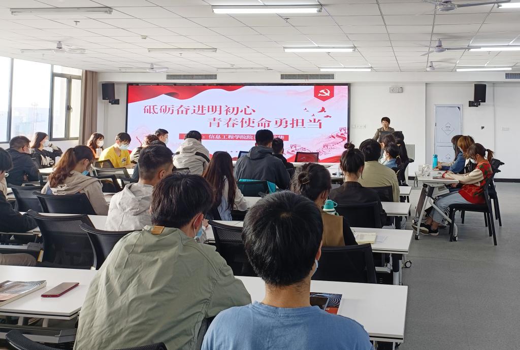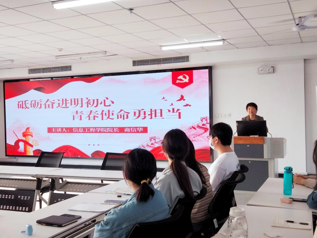 2022年4月21日下午,信息工程学院院长商信华在双创中心618会议室为网络工程19级、数据科学与大数据技术19级学生讲授“砥砺奋进明初心,青春使命勇担当”主题思想政治理论课。