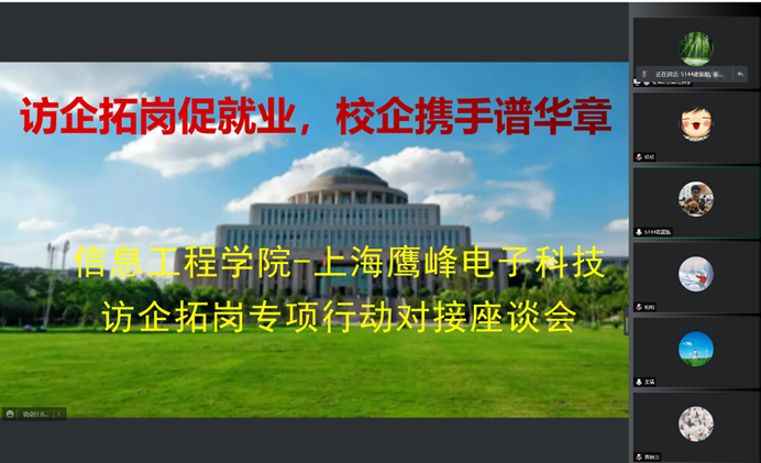 为进一步做好校园封闭管理期间2022届毕业生就业和2023届学生实习工作,扎实推进“访企拓岗”系列行动,5月11日下午,信息工程学院召开线上企业就业促进会,信息工程学院党支部书记梁其宇、党总支副书记朱猛、物联网工程教研室主任姜明富、物联网工程教研室副主任张克旺以及信息工程学院毕业生辅导员严舒平、许华瑾、张睿参加。此次就业促进会邀请了上海鹰峰电子科技股份有限公司和上海澳通韦尔电力电子有限公司参会,两家企业的参会人员包括企业的人力资源总监和研发部总监等。