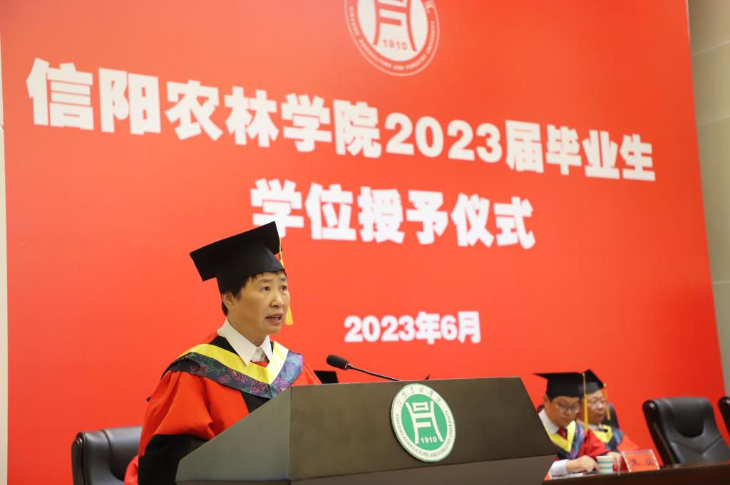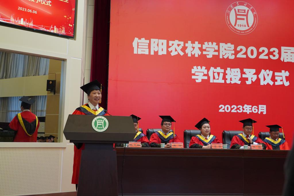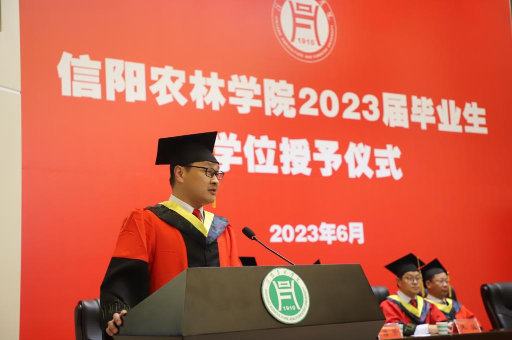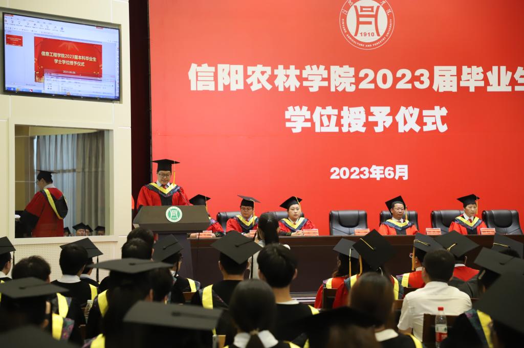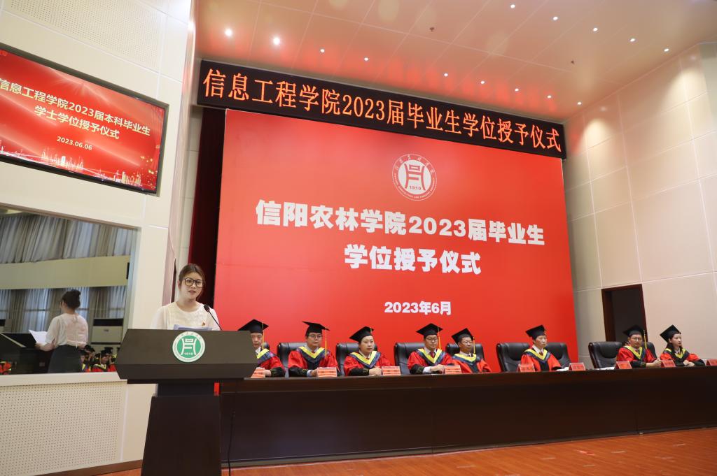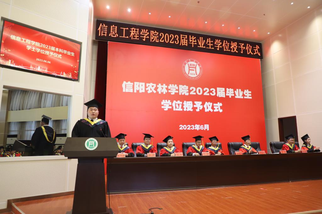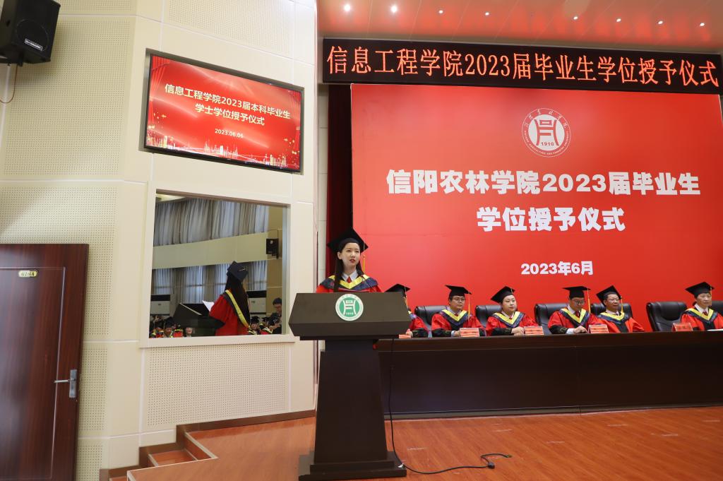 学位授予仪式在庄严的国歌声中拉开帷幕。副院长潘赟宣读了学校2023届毕业生学士学位授予决定及信息工程学院授予工学学士学位毕业生名单;副书记朱猛宣读了学院2023届优秀毕业生名单,并颁发了荣誉证书。教师代表黄蓉、毕业生代表孙一可、在校生代表刘星语先后上台作了发言。