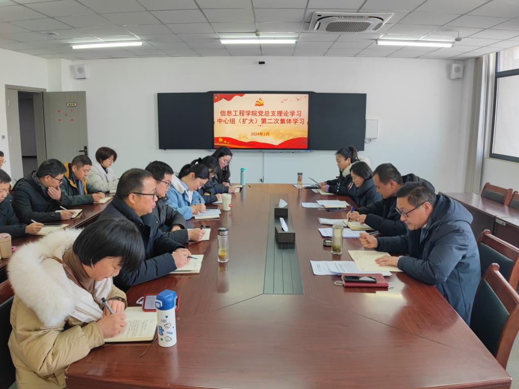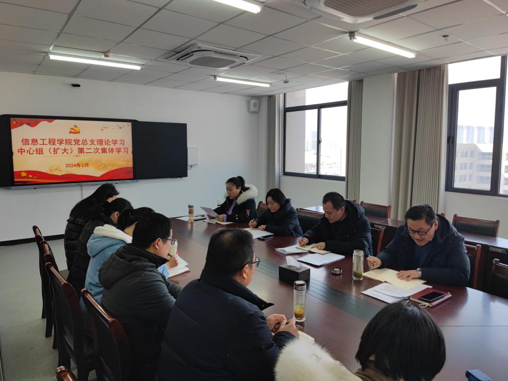 2月27日上午,信息工程学院党总支在双创615会议室召开理论学习中心组(扩大)第二次集体学习会。学院班子成员,各党支部书记、各科(室)负责人参会,会议由党总支书记栗磊主持。