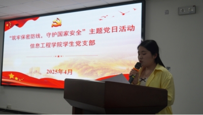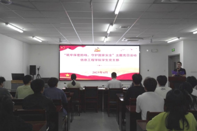 为深入贯彻落实总体国家安全观,强化党员保密意识与法治观念,4月22日,信息工程学院学生党支部以"筑牢保密防线,守护国家安全"为主题,开展了一场内容丰富、形式多样的主题党日活动。信息工程学院学生第一党支部书记姚清源、学生第四党支部书记张彪、学生第二党支部组织委员李佳阳等出席活动,活动由学生第三党支部书记谭翔升主持,全体在校党员积极参与。