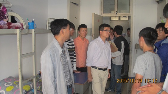 2015年10月19日中午12:30,信息工程学院学工组的各位辅导员在副院长李友国带领下对我院在校学生寝室进行安全卫生情况检查。