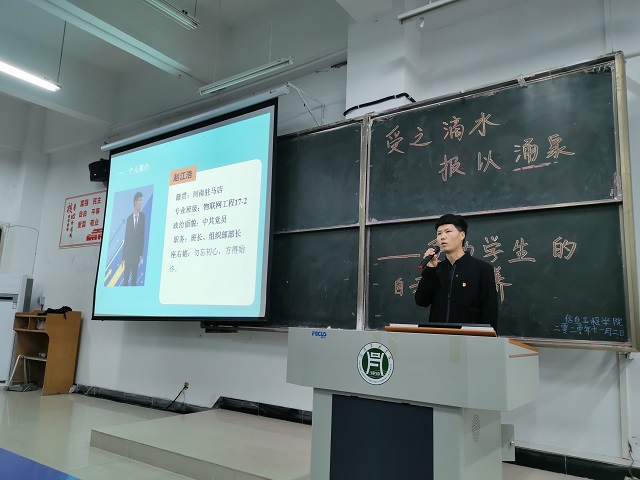 为了贯彻落实“三全育人”教育理念,进一步深化“资助育人”工作内涵和提高工作实效,打造物质帮扶与精神激励有效融合的育人长效机制,培养学生的感恩与社会服务意识,2020年11月2日晚7点,信息工程学院在一教E102教室举行了以“受之滴水,报以涌泉”为主题的资助育人宣讲会。信息工程学院团总支书记严舒平、辅导员房正武、吉秉彧、刘昊然、李洋出席本次会议,学院全体贫困生参加。