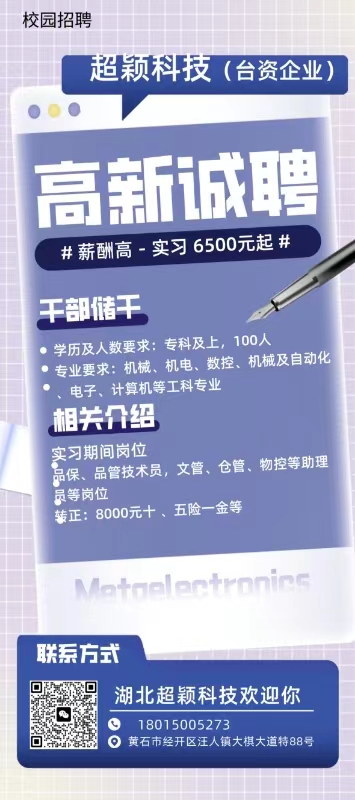招聘岗位: 技术、管理等储干岗位(为2024年4月新建产线投产人才储备