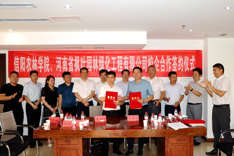 最后,林学院院长孙耀清和蔡正江代表校企双方签订合作框架协议,并共同为校企共建“信阳市特色乡土树种培育工程技术研究中心”揭牌。