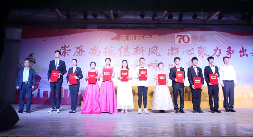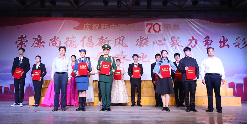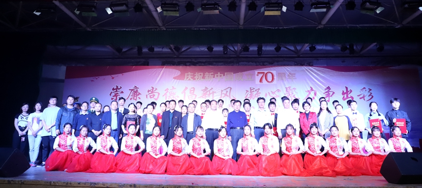 为庆祝新中国成立70周年,热情讴歌伟大祖国取得的光辉成就,为廉洁校园建设营造崇廉尚廉的浓厚氛围,5月9日晚7时,由校纪委、校团委联合举办的“崇廉尚德倡新风,凝心聚力争出彩”歌咏比赛在学生活动中心举行。党委副书记刘光生、扶庆,副校长赵一鹏、王庆兵,纪委书记李强,党委委员、宣传部长王万玲,校纪委委员,各学院党总支书记、团总支书记、纪检委员和师生代表800余人参加活动。
