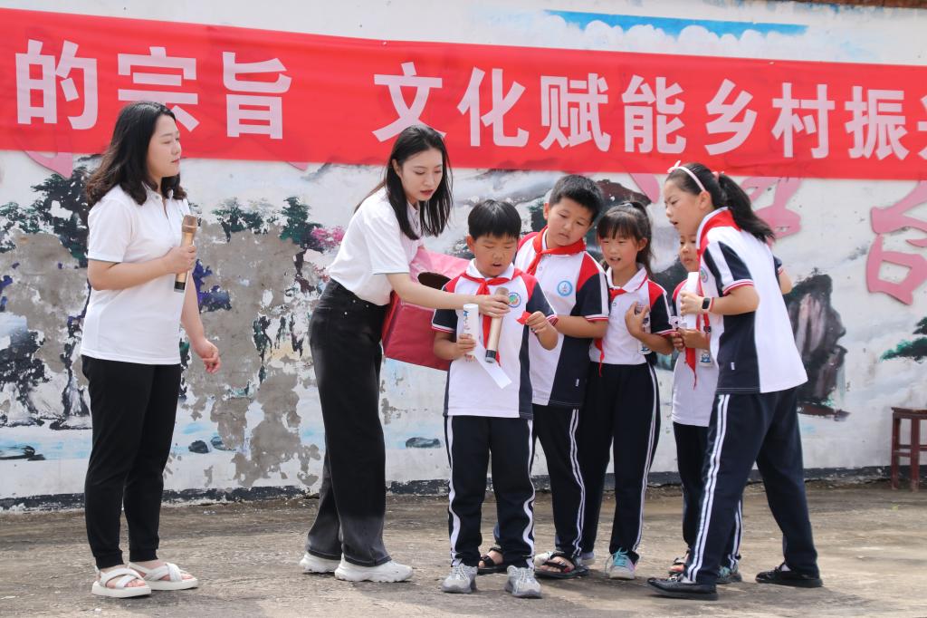 为做好此次活动,校语委办在前期进行了充分调研,选拔培养了一批优秀推普志愿者。来自融媒学院网络与新媒体专业师生经过精心准备,设置了“绕口令挑战”“乡规民约我来读”“二十四节气猜谜”三个环节,与现场一百余名村民、学生进行互动。在齐诵社会主义核心价值观、乡规民约等内容时,帮助村民树立规范发音意识,理解、认同准则规范,推动乡村民风、文化建设。“二十四节气猜谜”则充分联系村民生活实际,以反映节气的谚语为谜面,引导村民理解中华传统节气、节日的内涵。尽管天气炎热,但活动现场气氛热烈,大家在游戏中共同感受中国语言文字的魅力,感知推广国家通用语言文字的意义。