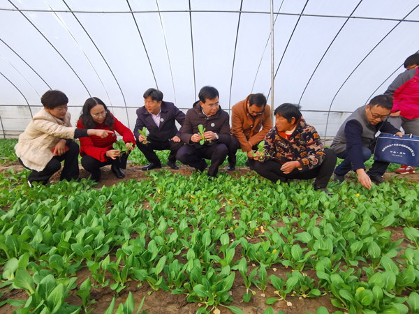 特派员服务团一行,在民权县龙塘镇秀兰种植专业合作社负责人轩秀兰的陪同下,对大棚内种植的上海青,芹菜等蔬菜进行现场指导,服务团指出针对沙质土壤保肥保水能力较弱的情况下,在叶菜类蔬菜生长的中后期应加强肥水管理,防止因缺肥导致幼苗发黄等生长不良情况。