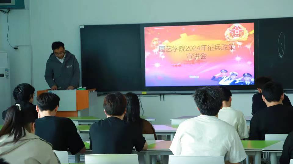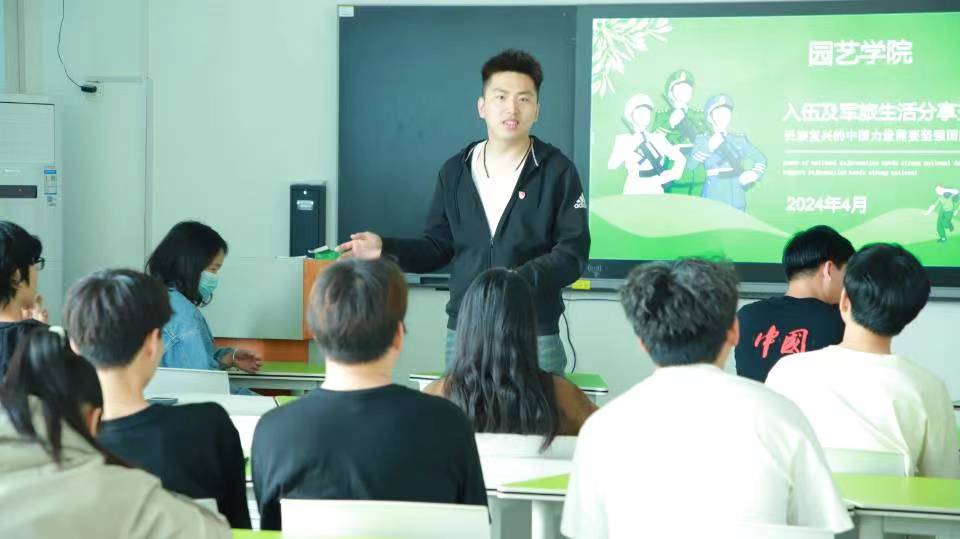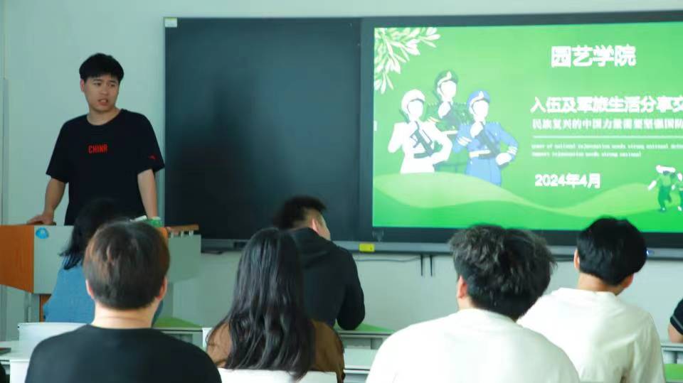 为贯彻落实征兵宣传政策,进一步加强大学生参军入伍的意识,加深对国家国防事业的关心,园艺学院于4月1日中午在实验楼2B306召开国防教育暨征兵宣讲会。会议由园艺学院武装专干郝玉伟老师主持,退伍复学学生牛文兰、卢焕坤和徐金鹏做分享报告,园艺学院80名有入伍意向的毕业生参加。
