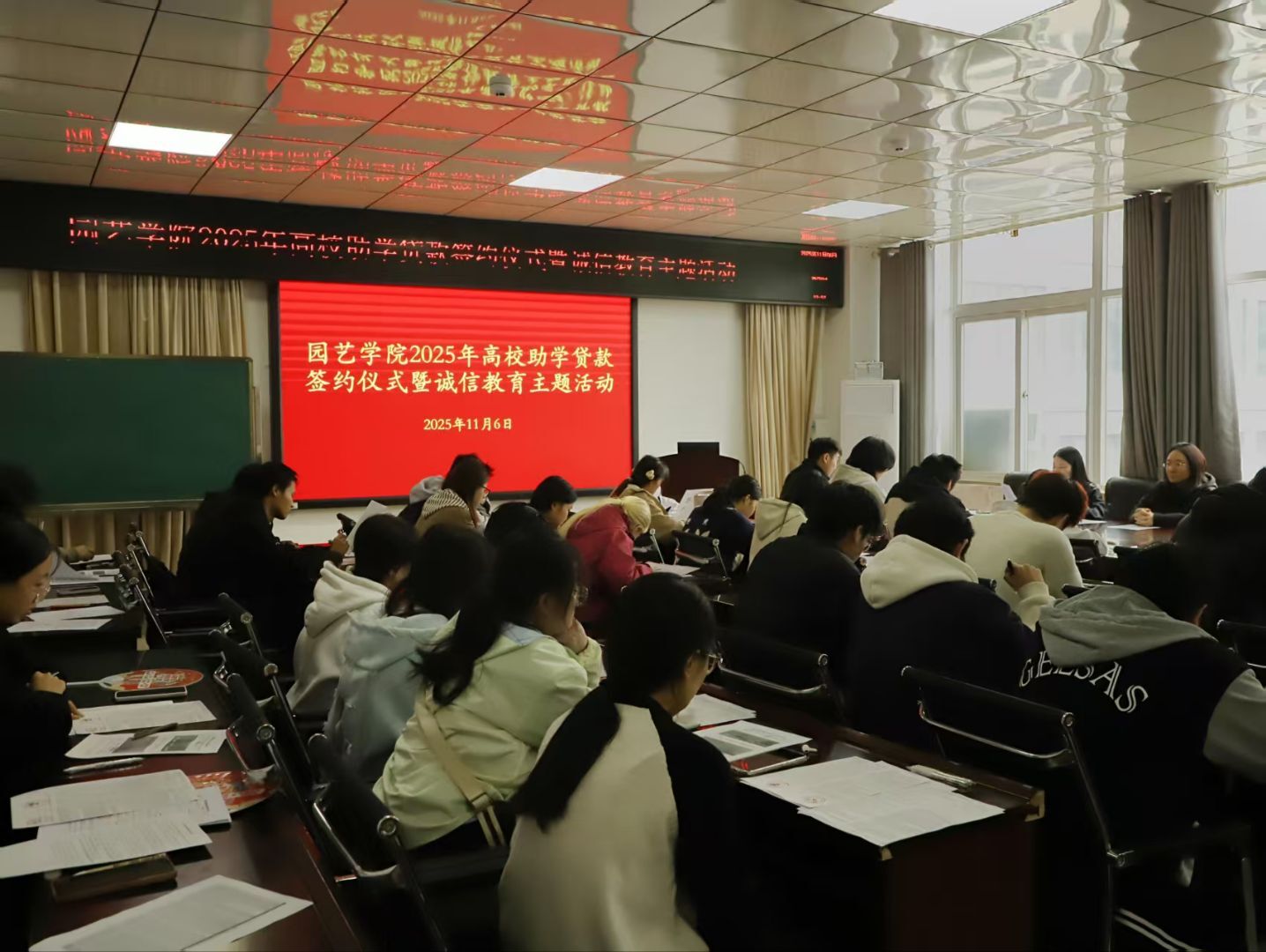 为深入贯彻落实国家资助政策,把党和政府关怀送到每个需要的学生手上,兑现“不让一名学生因经济困难而失学”的庄严承诺,同时强化学生诚信意识,营造良好的校园诚信文化氛围,园艺学院于2025年11月6日,在园艺学院2A322会议室隆重举行了高校助学贷款签约仪式暨诚信教育主题活动。园艺学院党委副书记孙琳苒、资助专员马敏以及申请高校助学贷款的学生参加了此次活动。