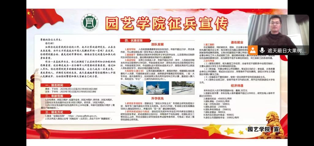 为加强征兵政策宣传,进一步贯彻落实国家大学生征兵入伍政策,激发大学生参军入伍热情,鼓励和引导在校大学生积极参与应征入伍,我院于423日下午在园艺学院322会议室举行了2023年征兵宣传暨国防教育活动。会议由学院党总支副书记陈丽文主持,武装专干程一帆进行宣讲,23届毕业生代表出席了本次活动。