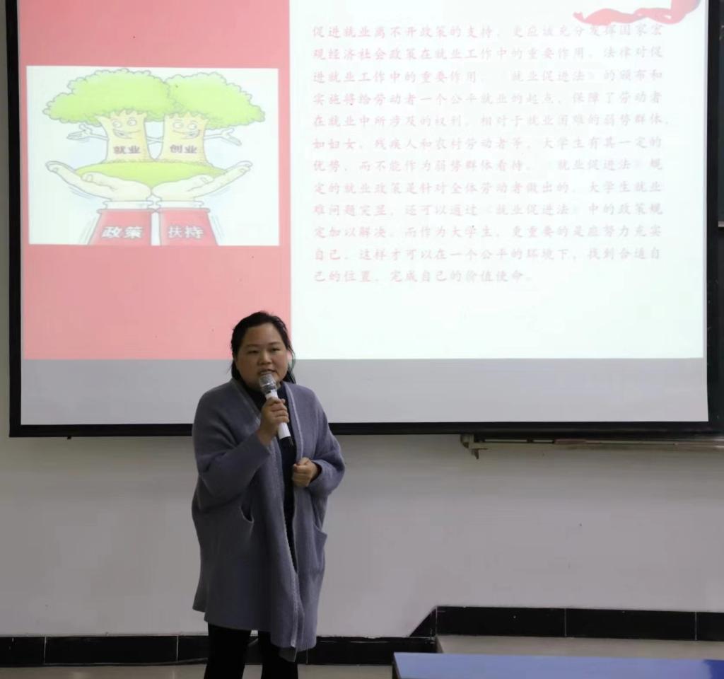 最后,党总支副书记陈丽文做出总结并提出四点要求,一是要求参会的各班学生干部代表要把今天的宣讲会议精神传达到班级每位同学,确保人人知晓就业法律法规。确保人人知法、守法、懂法;二要在就业创业过程中,发挥主观能动性,积极了解各类就业资源;三要充分研究就业政策,重视国家大政方针导向,抓住就业机遇;四是要突破就业过渡期,树立正确的就业观、择业观,正视当下就业严峻形势,找准自身发展方向。