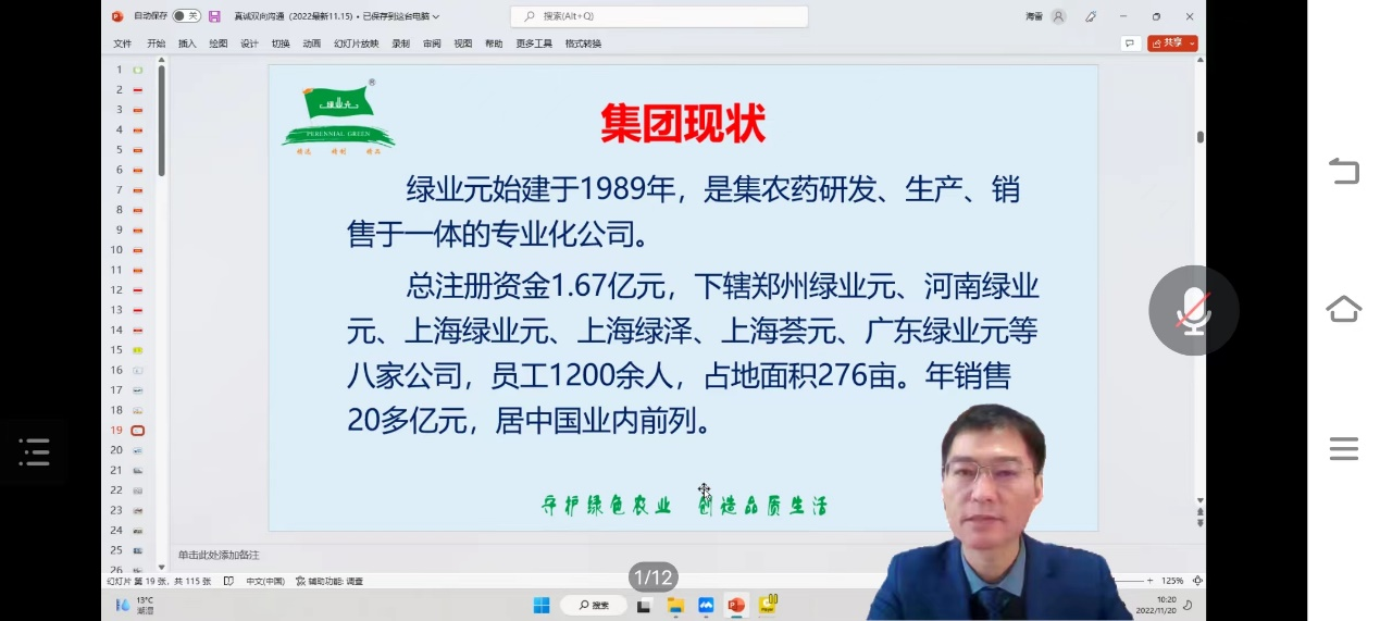 会议伊始,主讲人详细介绍了绿业元集团概况,绿业元集团具有中国农药行业标杆企业、全国农业制剂销量第一大单品创制企业和农业产品化龙头企业的美称。目前提供的岗位有市场业务员,农业技术工作人员,微信专员。