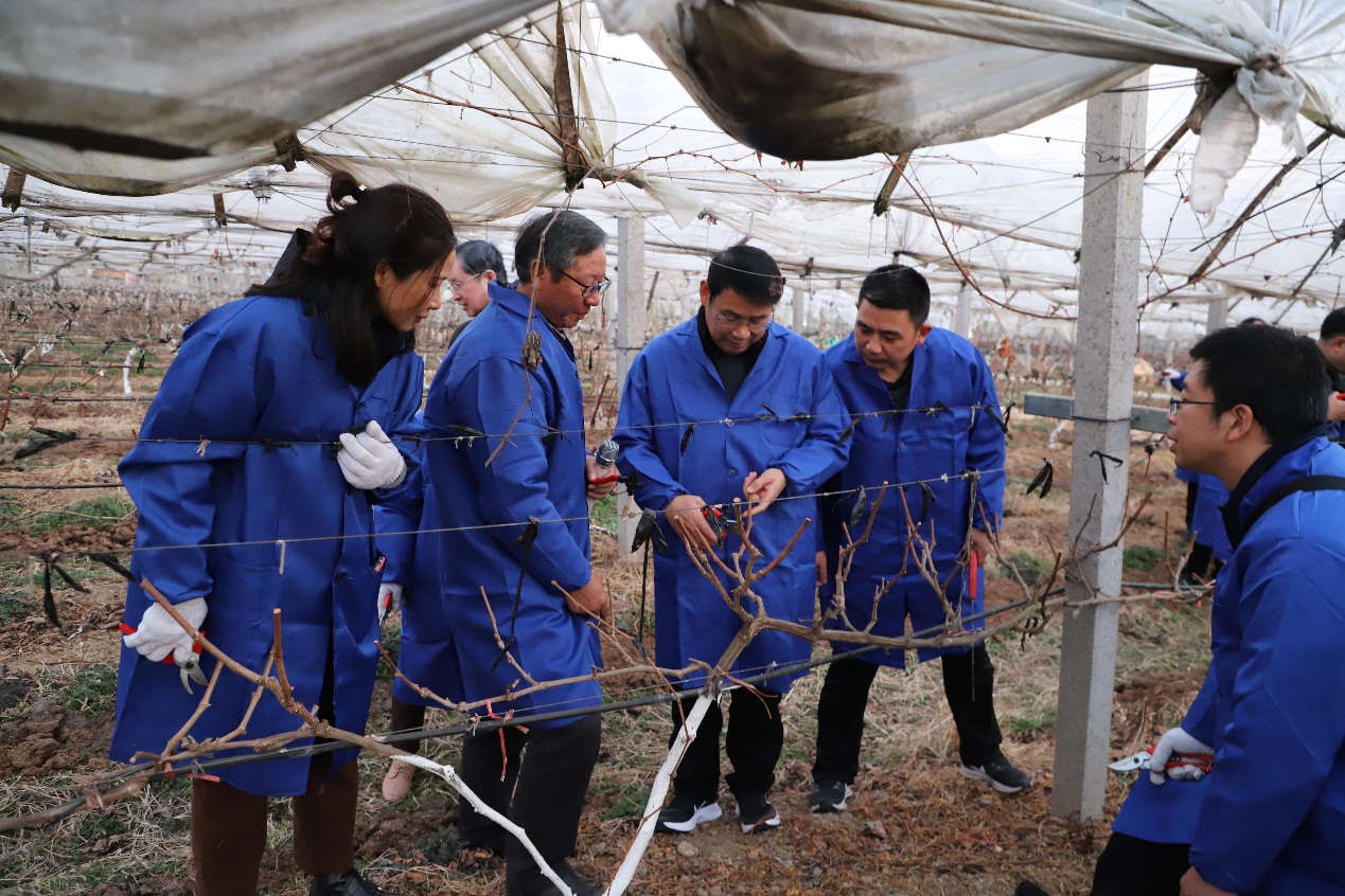 大练兵第二站——校外实习基地信阳市青河湾生态农业科技有限公司,有“豫南第一剪”称号的范宏伟教授对晚秋黄梨、无核大十果桑和“阳光玫瑰”葡萄等果树进行修剪示范和现场讲解,他强调果树修剪过程中,一要熟悉果树的生长习性,结合树势、肥水管理等进行修剪;二是要注意冬季修剪和夏季修剪相结合;三是注意短截、缓放、疏除等多种修剪手法灵活运用。各位教师在范教授的指导下积极认真的对梨树、桑树和葡萄进行整形修剪,并结合去年大练兵修剪的实效进行讨论和总结,加强剪后对株型生长、开花结果的观察,注重对修剪手法的检验,只有不断的反思并改进才能提升修剪水平。