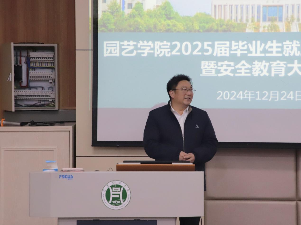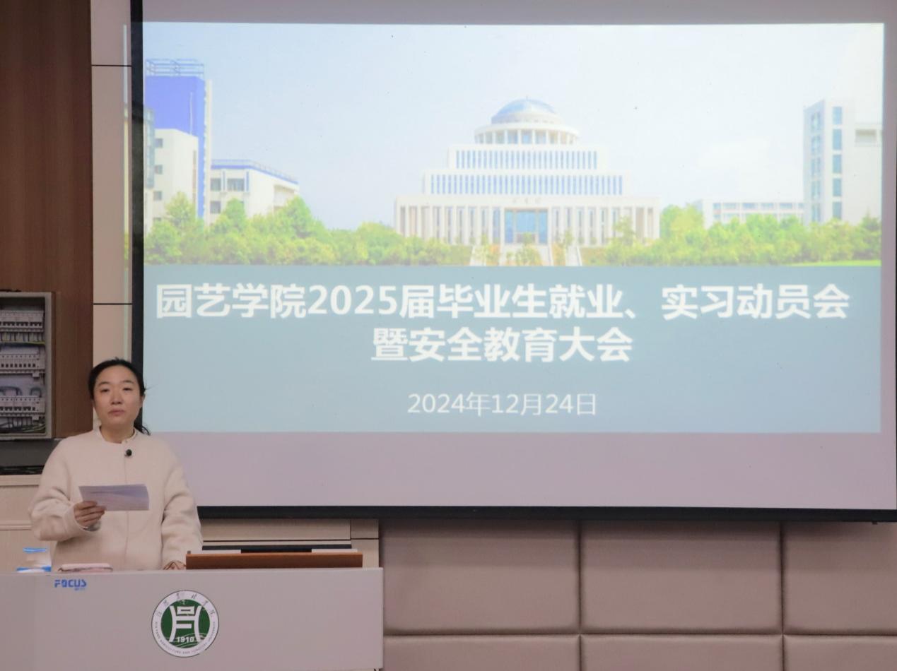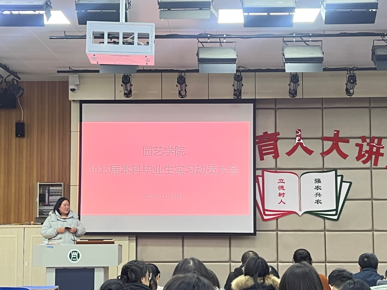 2024年12月24日,园艺学院2025届本科毕业生实习动员大会在一教E101室隆重举行。本次大会旨在为即将步入毕业实习阶段的本科准毕业生们答疑解惑、鼓舞士气,帮助他们更好地开启实习之旅,为未来的就业打下坚实基础。参加本次会议的人员有书记杜丽、院长龚守富、副书记孙琳苒、副院长刘松虎、副院长申君,还有毕业班辅导员以及相关专任教师,2025届全体本科毕业生齐聚一堂,共同参与此次意义重大的动员大会。会议由副院长申君主持。