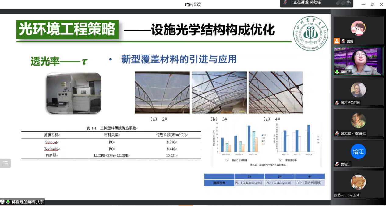 本次报告会,蒋博士重点围绕智慧光环境工程的智能算法模型开发与新型传感元件的开发、弱光条件下的光能利用模式开发、番茄光环境抗病机理等展开分享。聆听了蒋博士的精彩报告后,与会师生均表示受益匪浅。