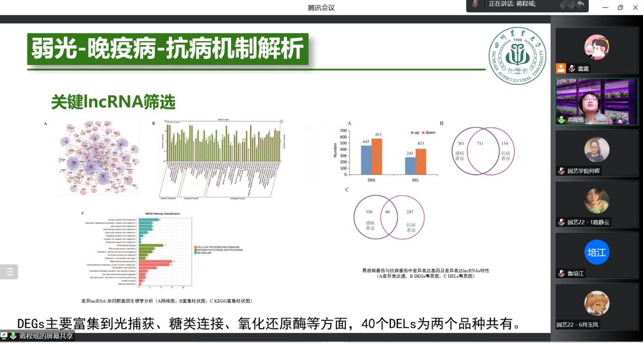 根据园艺学院科研氛围营造年及第一届园艺文化节活动方案安排,11月7日下午,园艺学院举办了“博雅讲堂”学术报告会。本次活动特邀四川农业大学蒋程瑶博士作了题目为“设施番茄高效光能利用模式与高光效基因的挖掘研究”的学术报告,本次报告采取线上方式进行。本期博雅讲堂由园艺学院副院长何晖主持,园艺学院领导及195名师生通过腾讯会议参会。