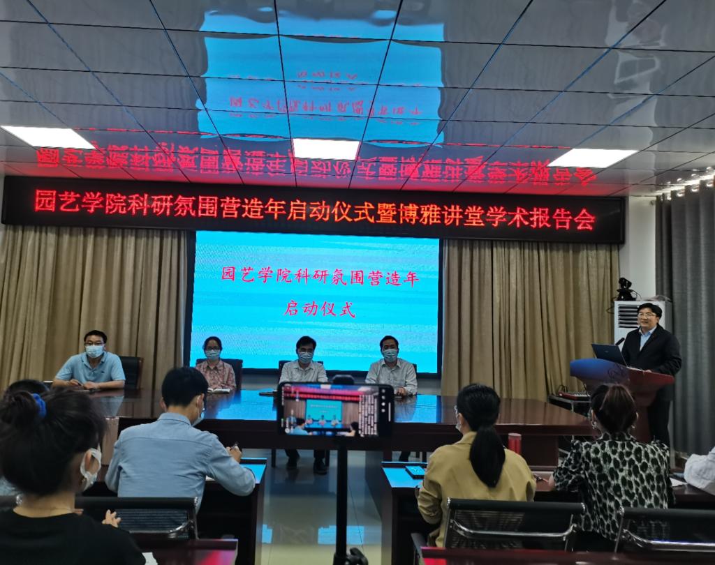活动首先进行的是园艺学院科研氛围营造年启动仪式,由龚守富主持并发言。他表示科学研究是高校四大职责之一,也是园艺学院提升内涵促发展的有力抓手,科研工作是学院前进的基石。按照学校要求,园艺学院制定了2022年“科研氛围营造年”活动实施方案。方案中,园艺学院以开展系列学术讲座为起点、以推动科研团队建设为焦点、以促进产业学院发展为亮点,继续助力学院学科建设与科研工作取得新发展、新突破。接着,龚守富宣布以新学期“博雅讲堂”开讲为载体正式开启“园艺学院科研氛围营造年”的序幕。