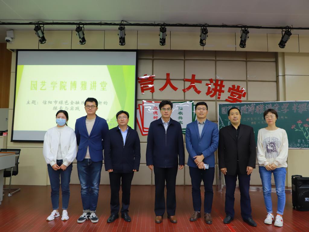 2022年5月15日下午,园艺学院在一教E101举办了本学期第二场“博雅讲堂”学术报告会。会议邀请了信阳市绿色金融改革创新试验区(气候投融资试点市)工作专班委员程东飞主任作报告,报告内容是信阳市绿色金融改革创新的探索与实践。副校长赵一鹏、园艺学院党总支书记张祖成、院长龚守富等共100多名师生参加了报告会,会议由院长龚守富主持。