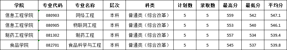 2023年,学校在海南省本科计划招生20人,实际录取20人。男生14人,女生6人。汉族18人,壮族1人,黎族1人。共青团员8人,群众12人。各专业录取分数见下表。