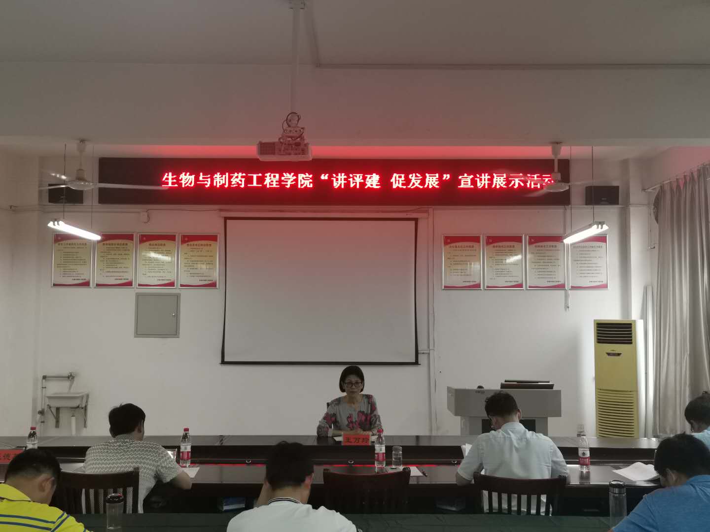 2020年8月20日下午,生物与制药工程学院开展了“讲评建 促发展”宣讲展示活动。副校长王万玲,生物与制药工程学院党总支书记冯世龙,院长段鸿斌,副院长王德芝、王家东出席活动。生物与制药工程学院全体教师参加活动。我院中层领导进行宣讲展示,王万玲作总结讲话。