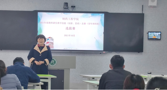 为鼓励教师积极钻研教学业务,更新课堂教学观念,推动课堂教学革命,改进课堂教学方法,进一步提升教师课堂教学创新能力,引导教师潜心教书育人,强化课程思政,促进教师专业发展,全面提高教育教学质量,根据学校《关于举办2021年度教师课堂教学技能(创新、思政)竞赛的通知》文件精神,10月18日,制药工程学院2021年度教师课堂教学技能(创新、思政)竞赛(青年理科组)选拔赛在实验楼E325教室成功举办。院长段鸿斌,副院长王德芝、王家东出席活动,三位院领导与各教研室主任和青年教师代表、河南省教育系统2021年教学技能竞赛(大学工科)组“一等奖”获得者潘岩共同担任此次选拔赛的评委,全体当日无教学任务教师参加活动,活动由王家东主持。