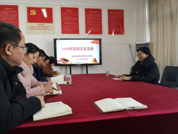 1月28日,生物与制药工程学院党总支在2C526召开2020年度民主生活会。会议由院党总支书记冯世龙主持,全体班子成员参加,校党委委员、副校长王万玲参加会议并讲话。