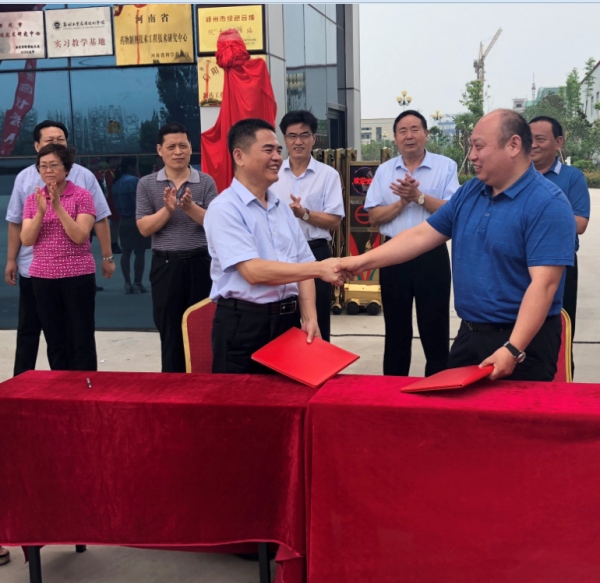 会后,全体人员移步至公司门前广场举行校企实训基地签约揭牌仪式。在热烈喜庆的氛围中,马俊义院长和周永智总经理代表校企双方签约,周遂成董事长和赵一鹏副校长为基地揭牌。